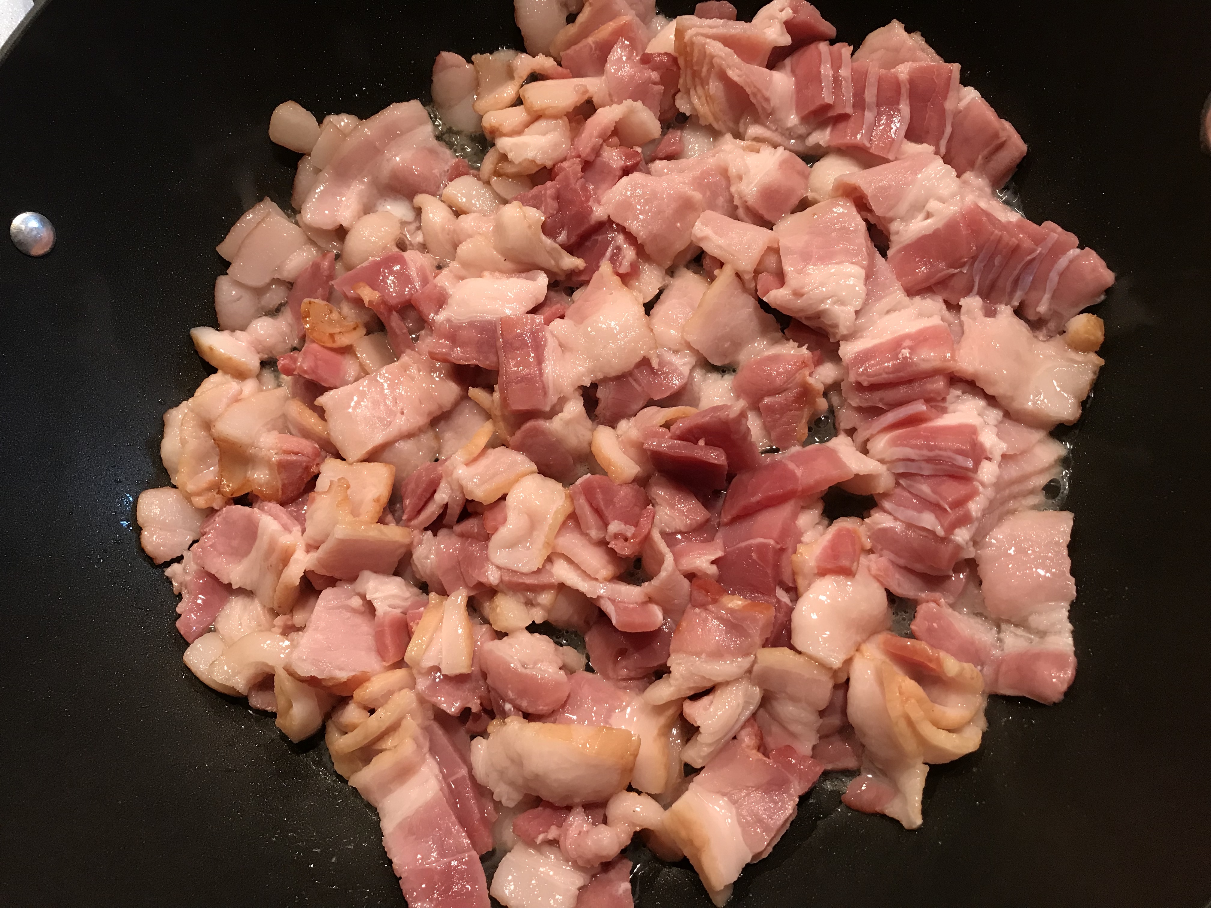 1. Start by cutting the bacon and fry it in a deep skillet or wok on med/low heat until crispy brown.