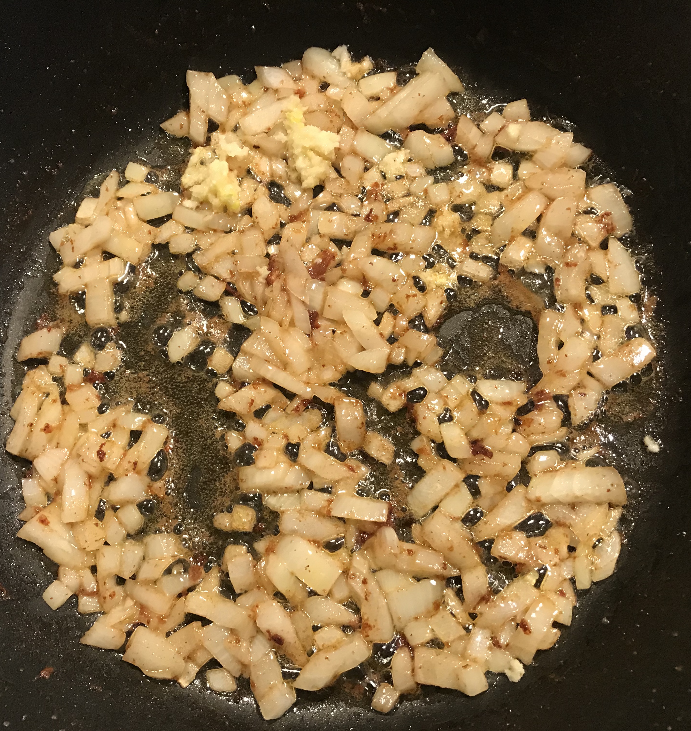 4. To the same skillet, add 2TB of butter, add 1 chopped onion, 2 cloves of pressed garlic and cook for 1-2min. Then add 2 cups of heavy whipping cream and bring it to a simmer.