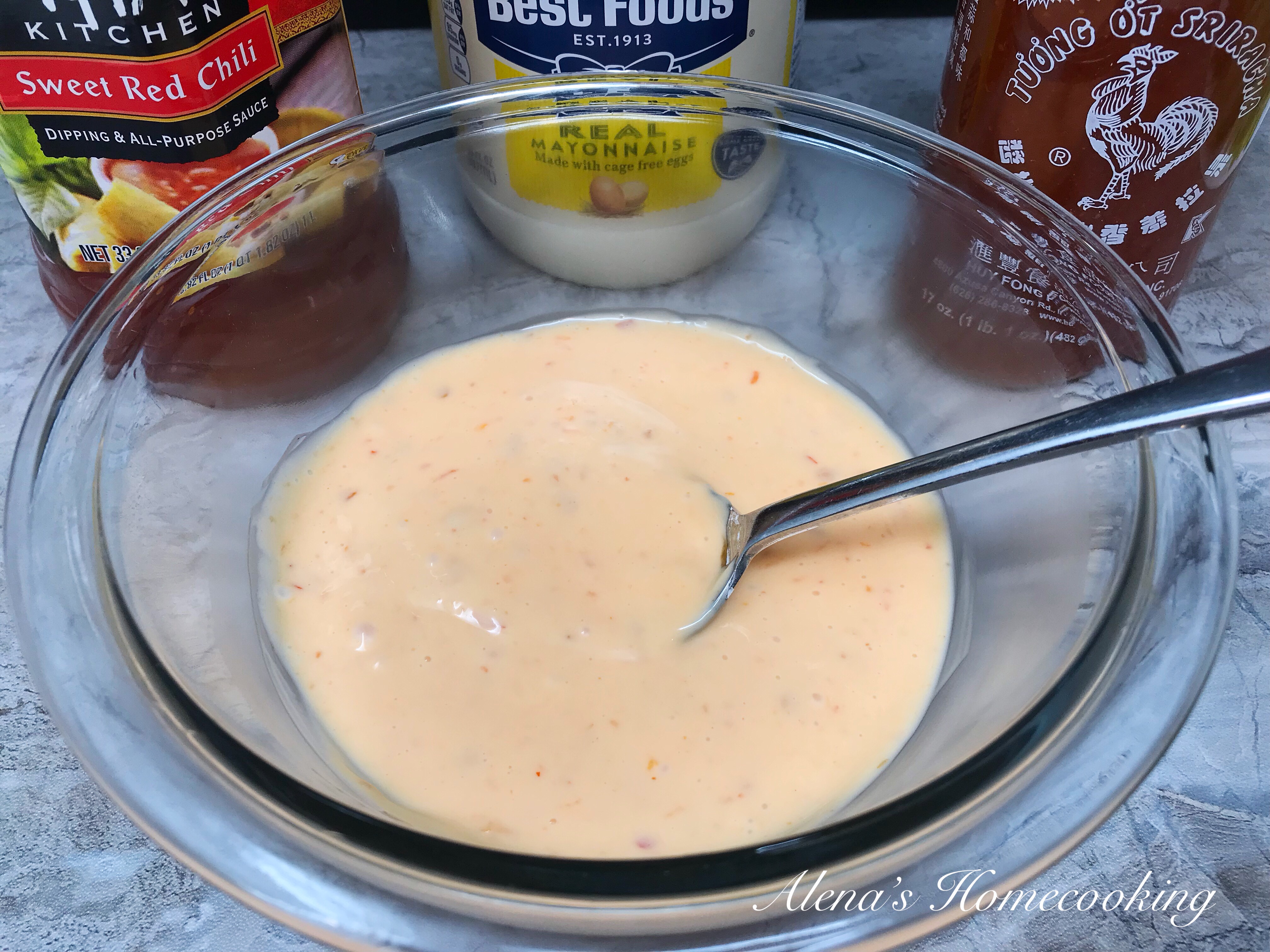 4. In a bowl combine 1/2cup of mayonnaise, 1/4cup of Thai sweet chili sauce and 1/4tsp Sriracha (more if you want more spicy)