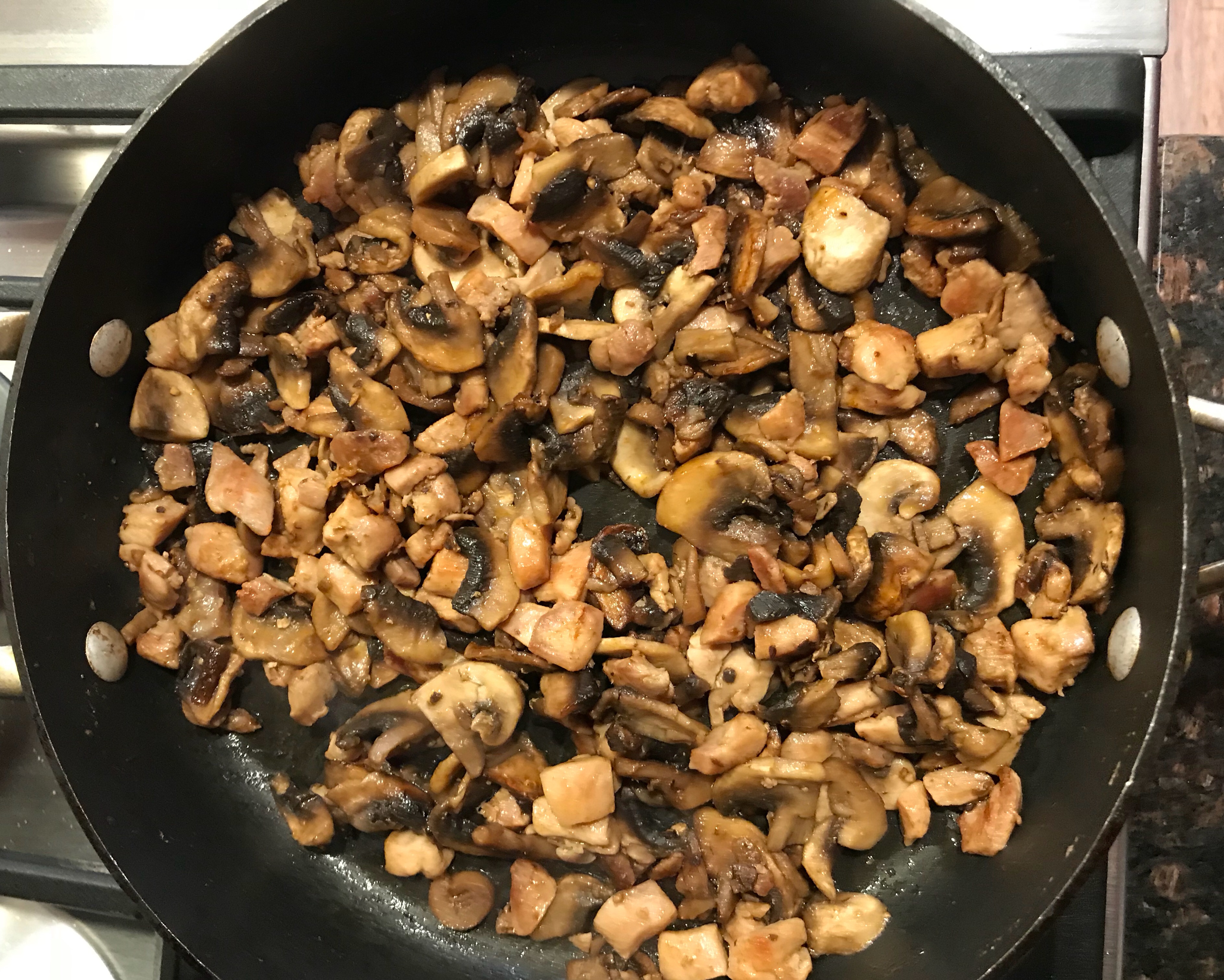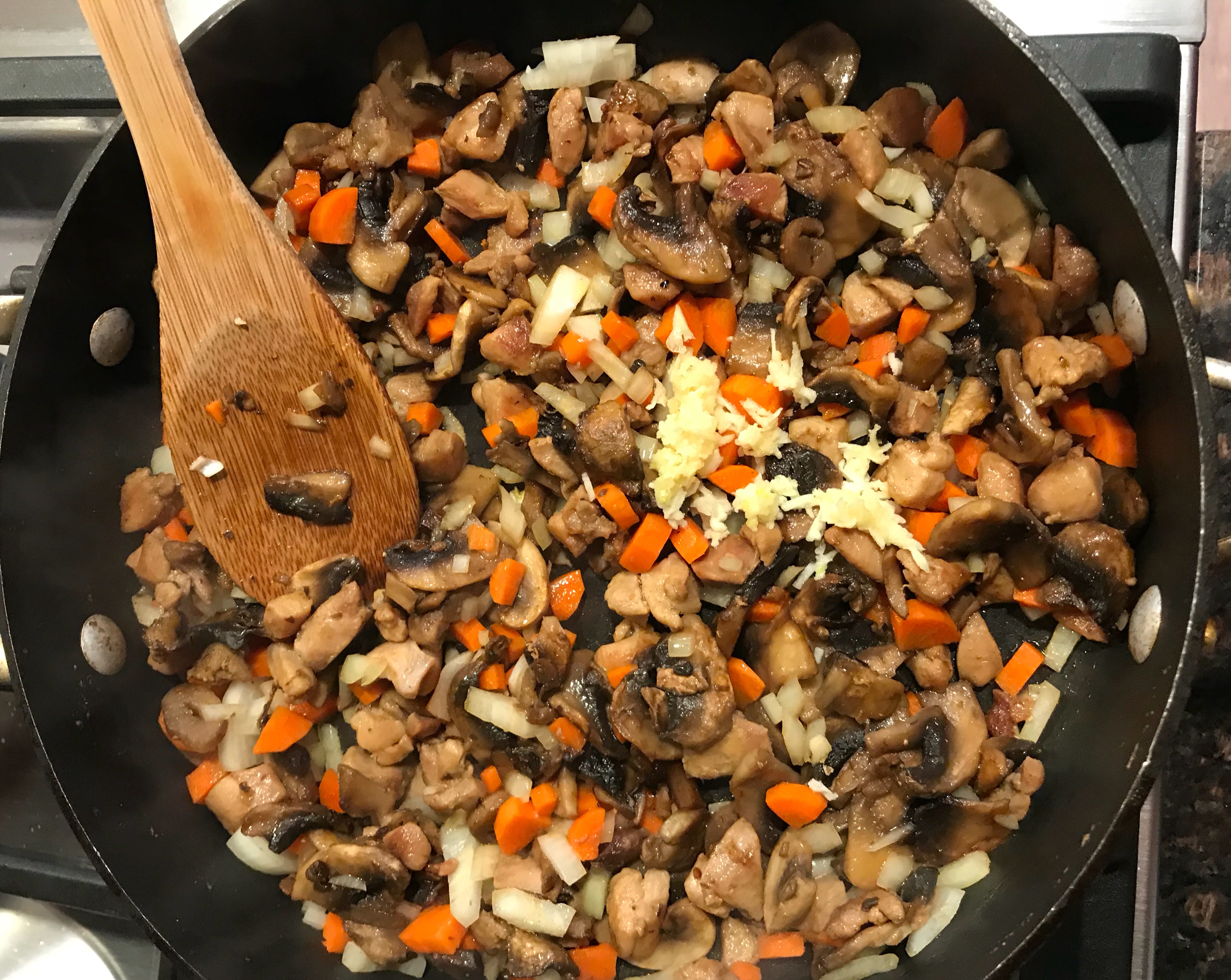 4. When the potatoes are cooked through, add the chicken and mushroom mixture as well as 3/4 cup of elbows pasta (can use any small size pasta).