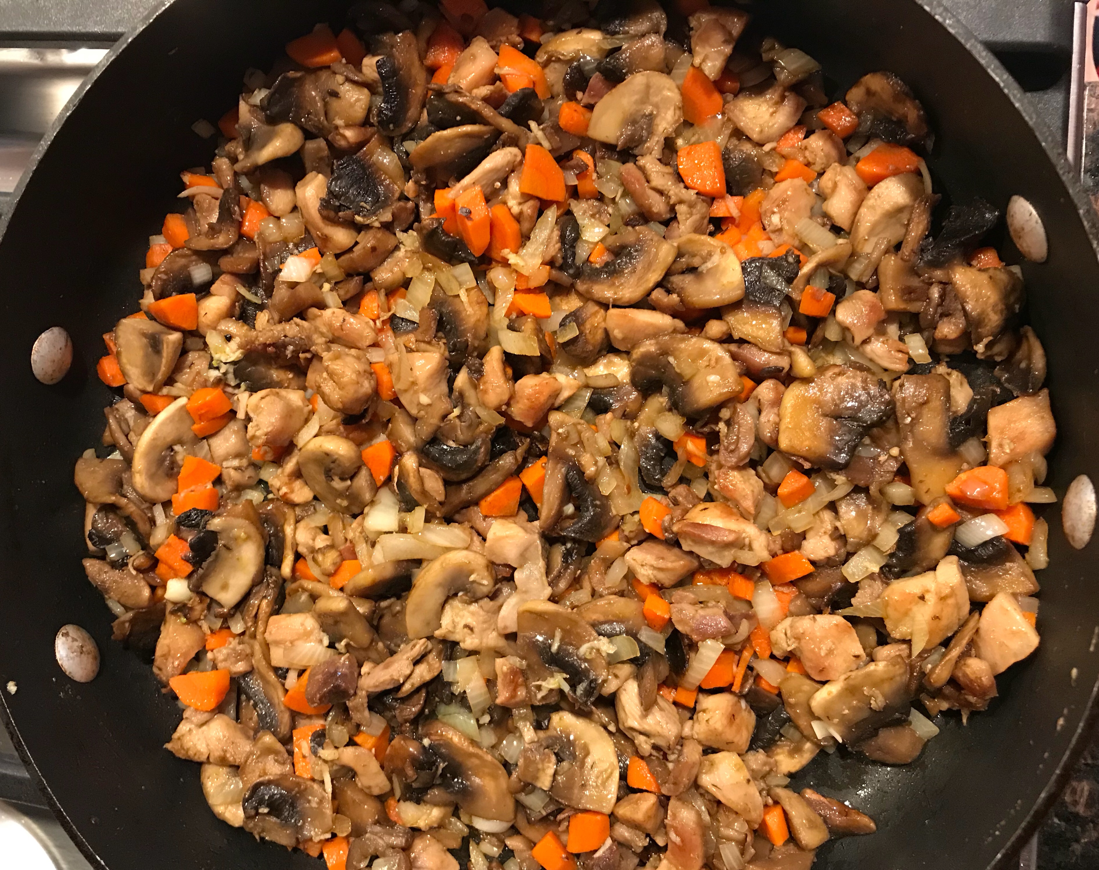 4. When the potatoes are cooked through, add the chicken and mushroom mixture as well as 3/4 cup of elbows pasta (can use any small pasta).