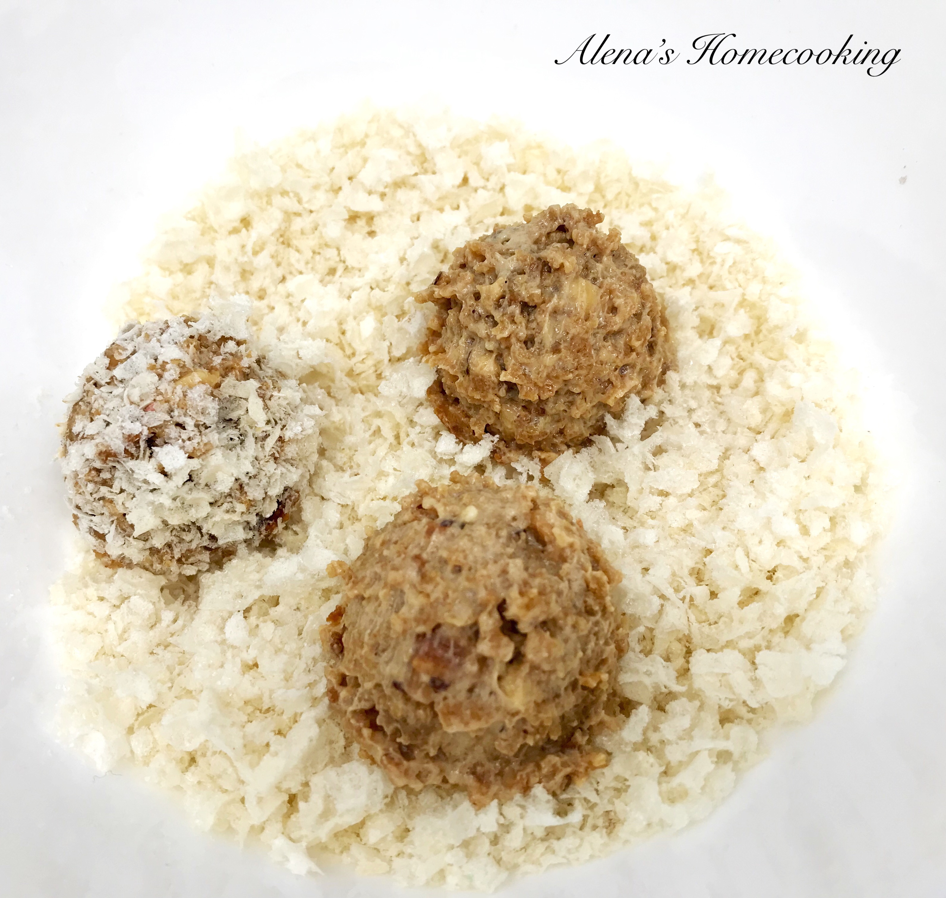 4. Form small balls with your hands or use a cookie scoop if you have one and dredge the cake balls into any dry mix you come up with. ( I used crushed waffles, if you don't have waffles, you can use cocoa powder, powdered sugar, crushed nuts, crushed cookies etc..)