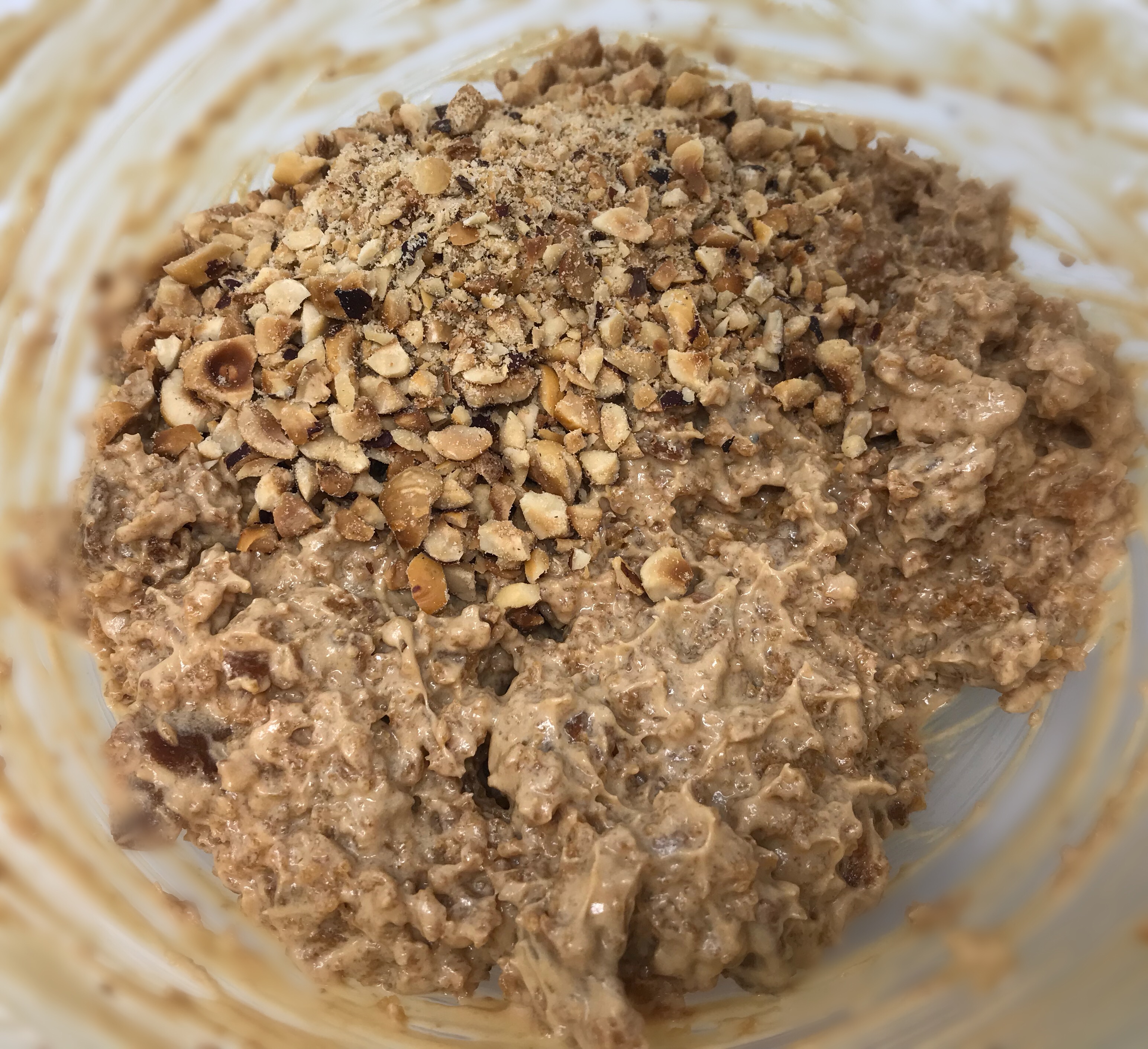 3. Mix the dough and cream together, then add the toasted hazelnuts(chopped to small pieces) and mix again until incorporated.