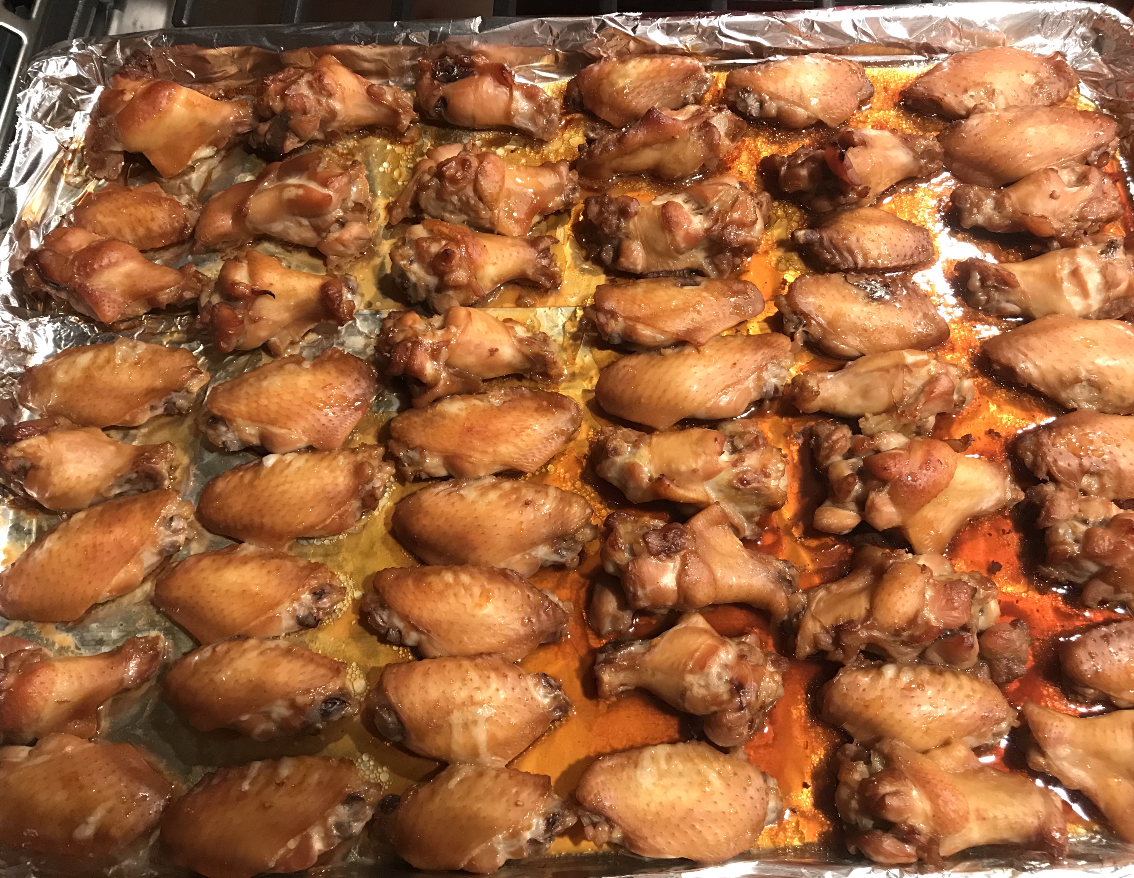 - Drain the sauce and lay out the chicken wings on a sheet pan (cover with foil for easy cleaning) and bake in the oven at 350F for 40-45 min.