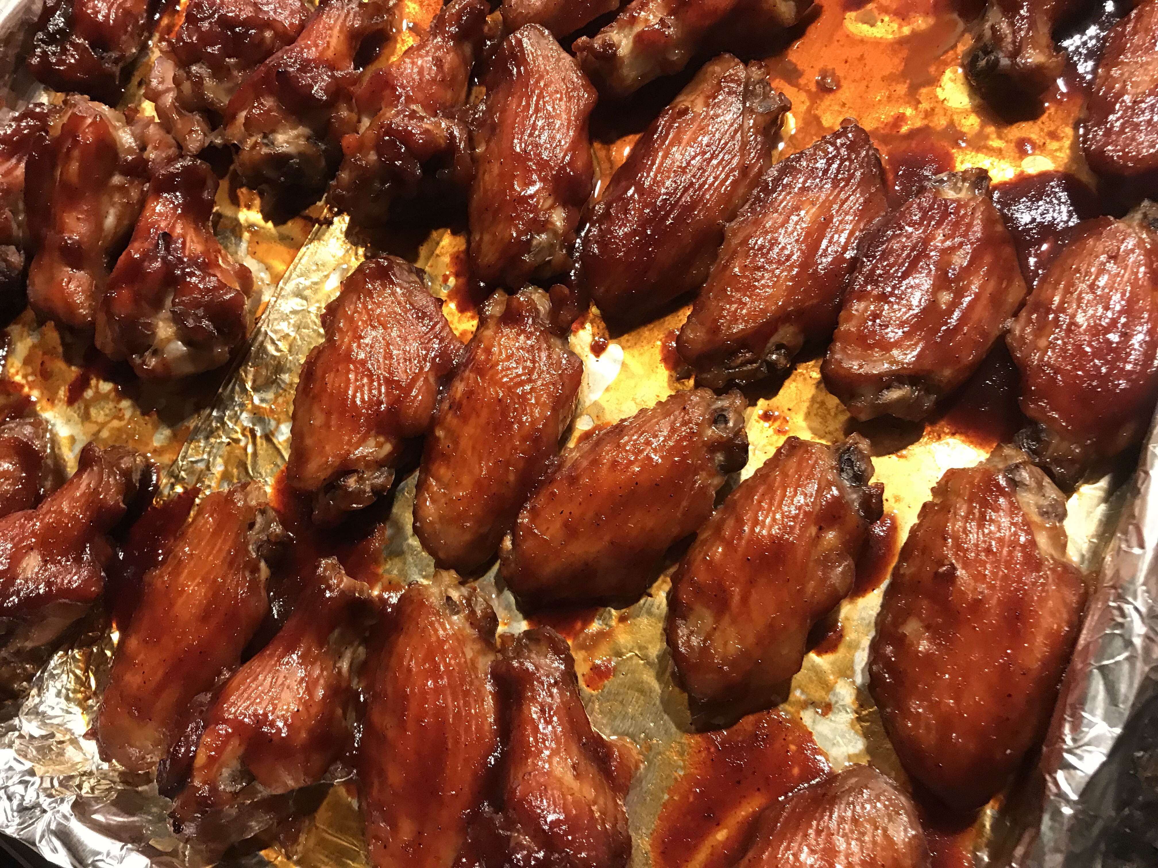 - Bring the oven temperature down to 250F, take out the wings and rub with your favorite BBQ sauce and put them back in the oven for another 5-10 min (or until the BBQ sauce is no longer runny. Glaze with BBQ sauce one more time and put them back into the oven for another 5-10 minutes. (You may repeat glazing a third time for a thicker sauce glaze if desired)