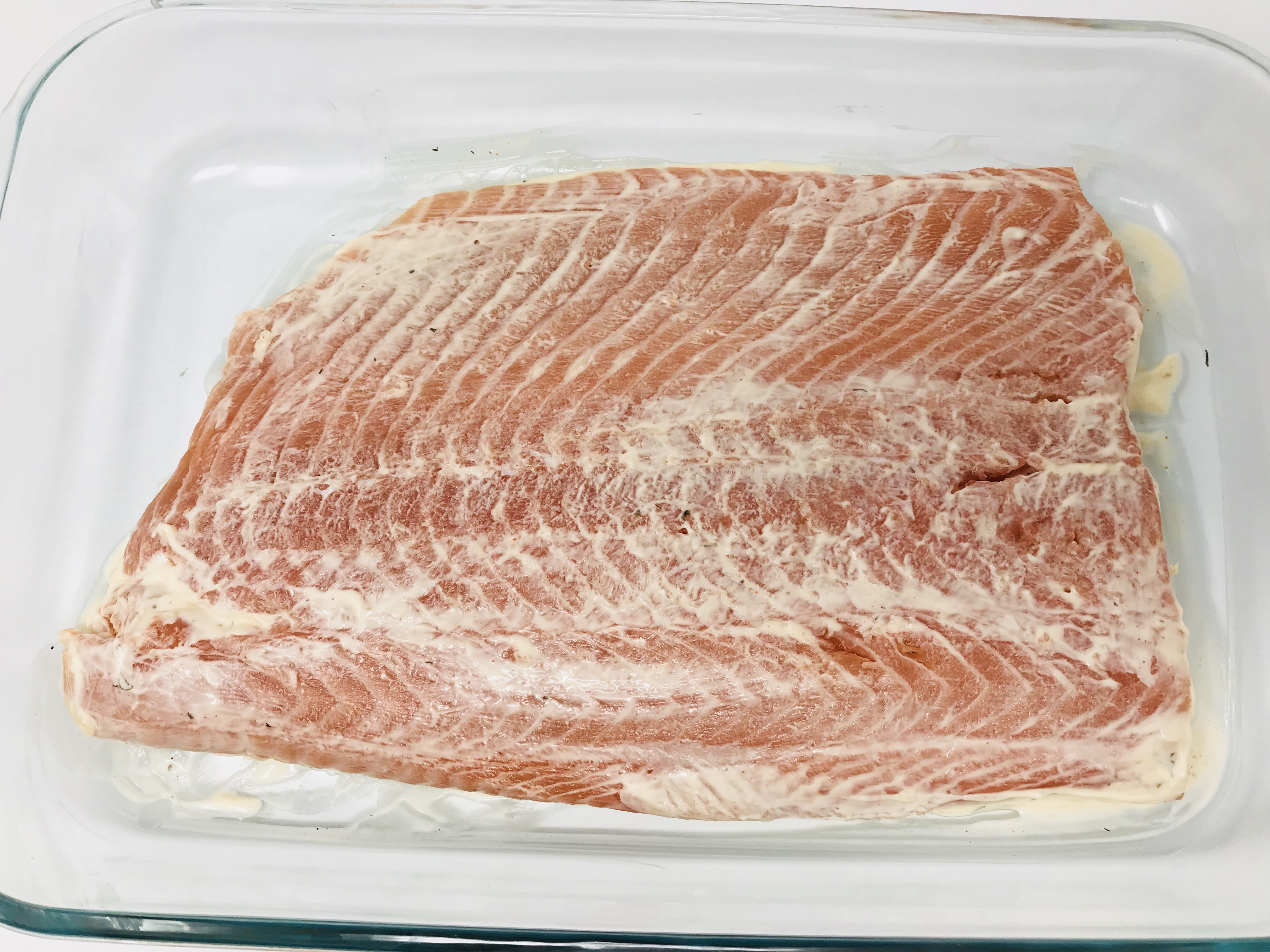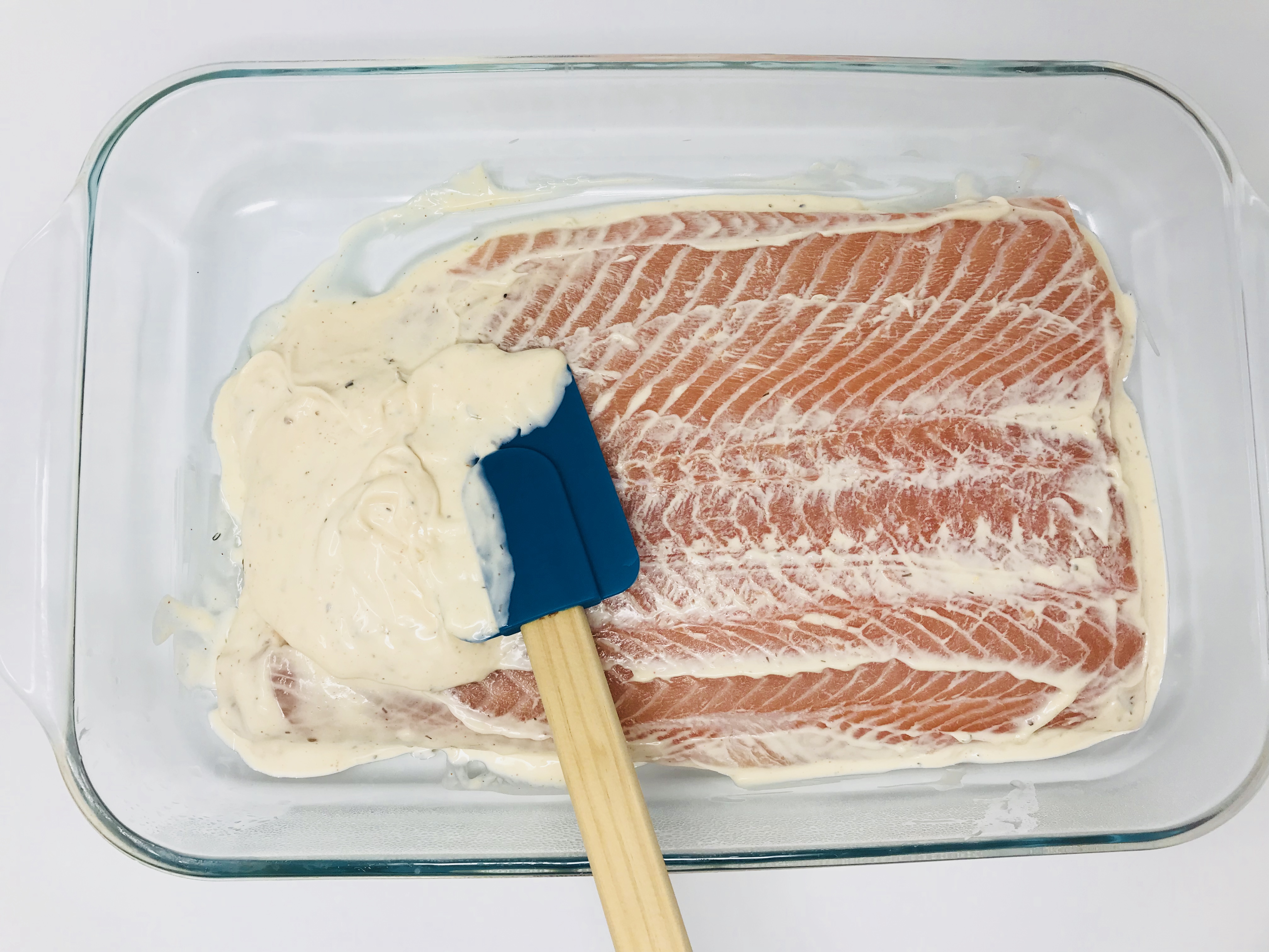 4. Prior to baking, using a rubber spatula or a spoon, scrape off the excess mayo mix from top and bottom.