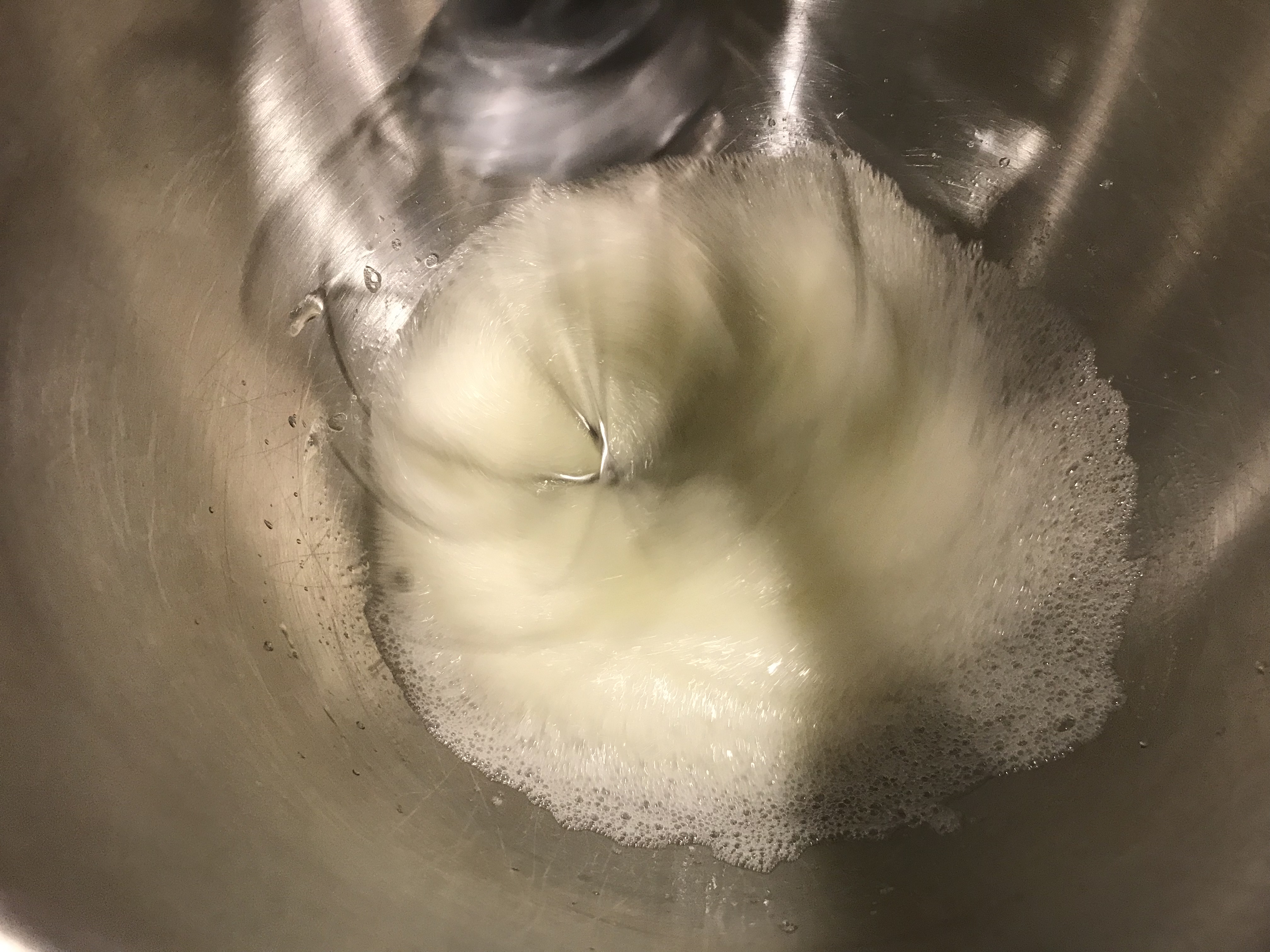 - Begin to add sugar to the egg whites AFTER you start seeing tracks from the whisk.