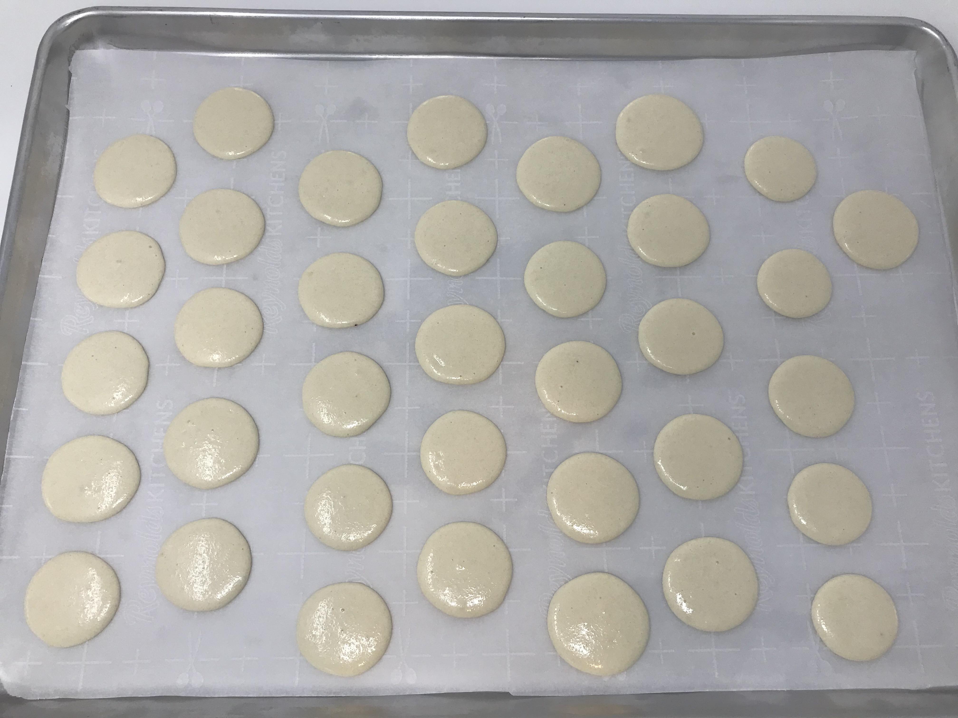 Transfer the batter into a piping bag using a round tip and pipe quarter size circles 1/2"-1" apart and tap the baking sheet firmly against the counter to release any air bubbles.
