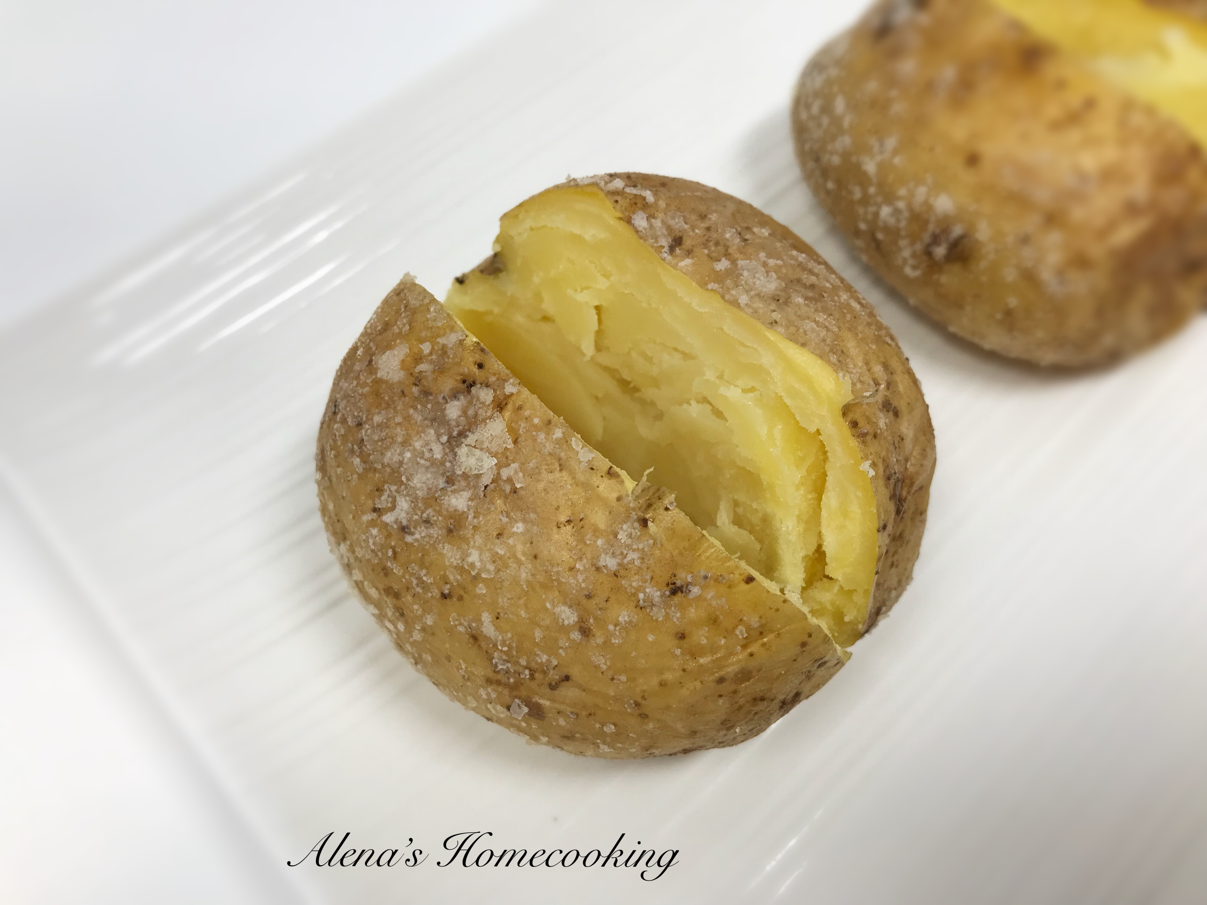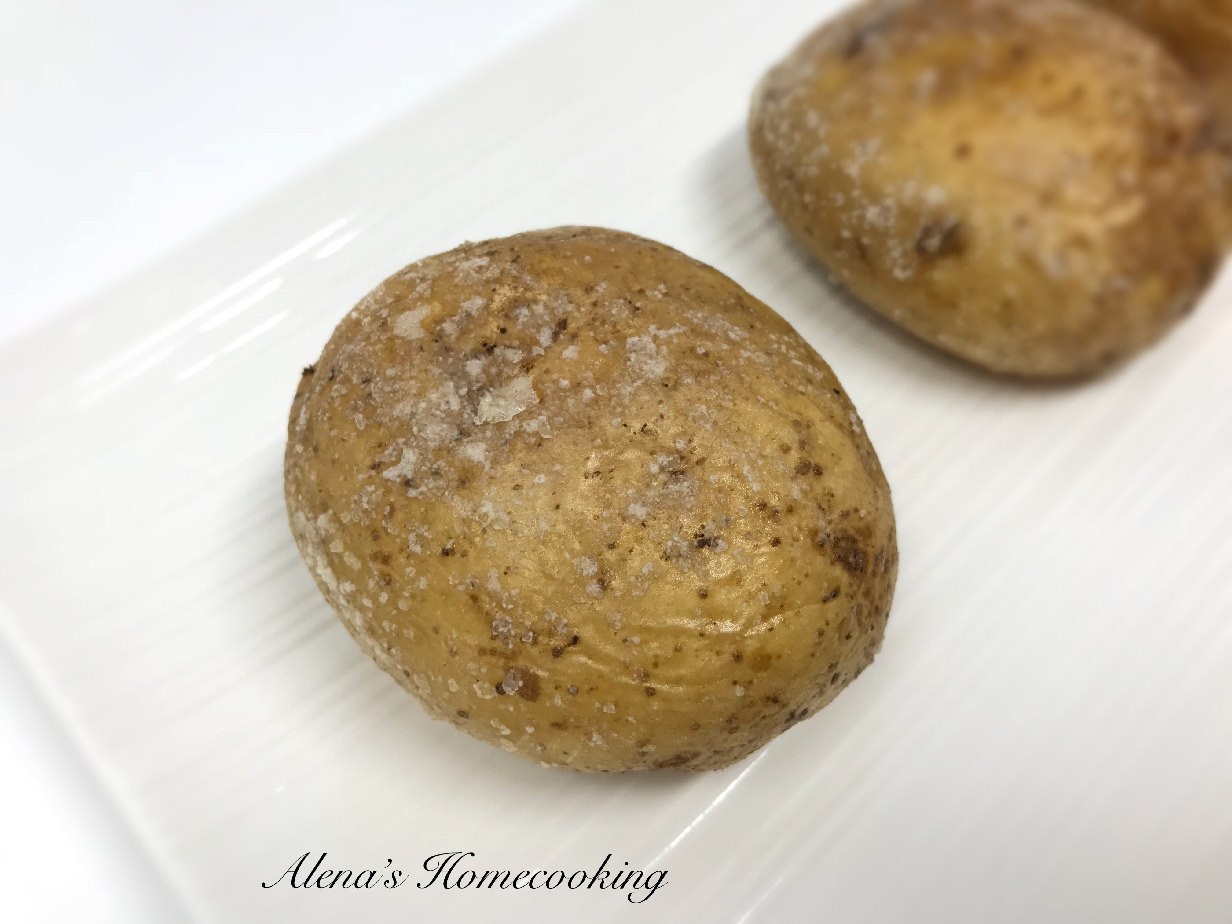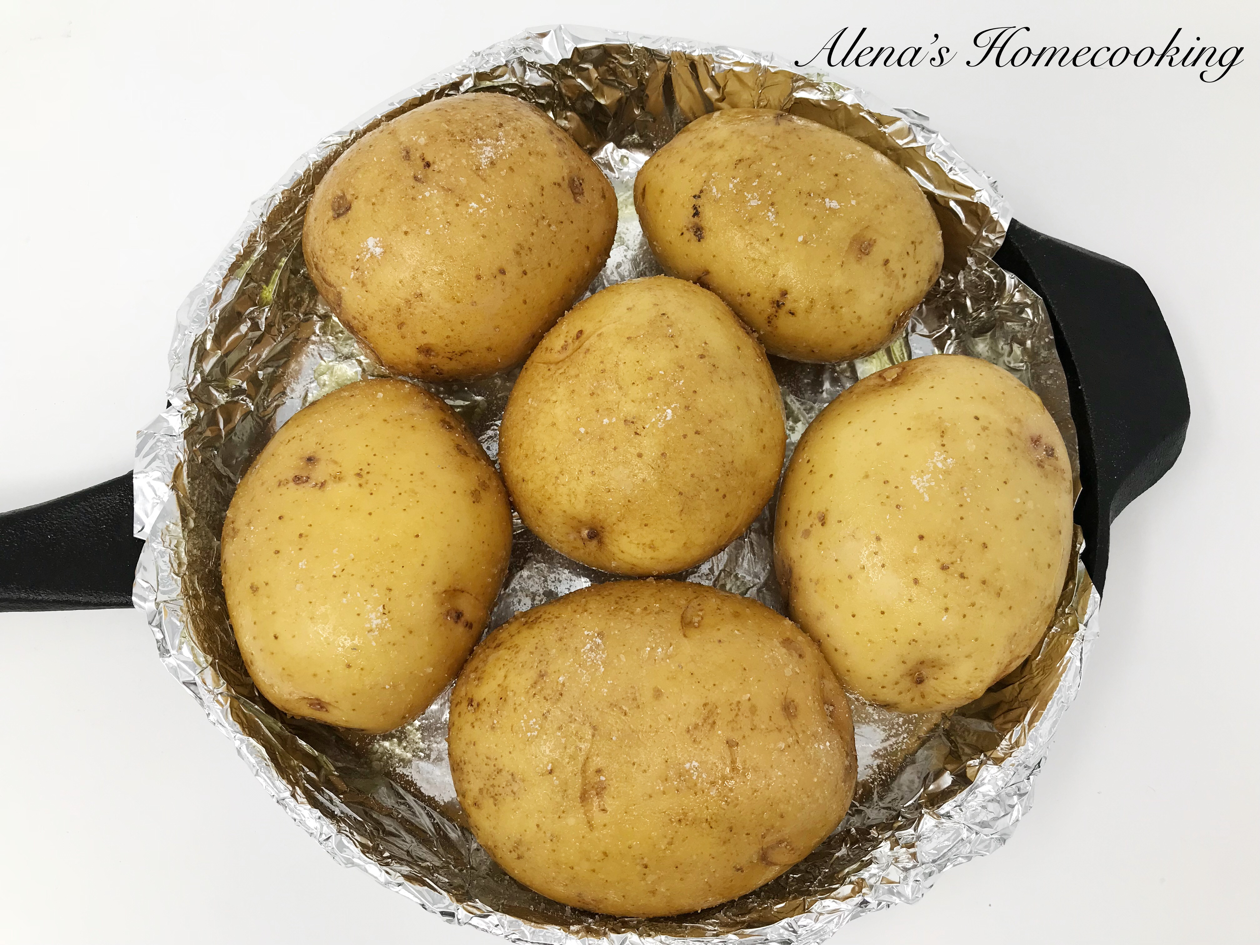 - Wash the potatoes and wipe with a paper towel. Rub each potato with olive oil and sprinkle with kosher salt all over.