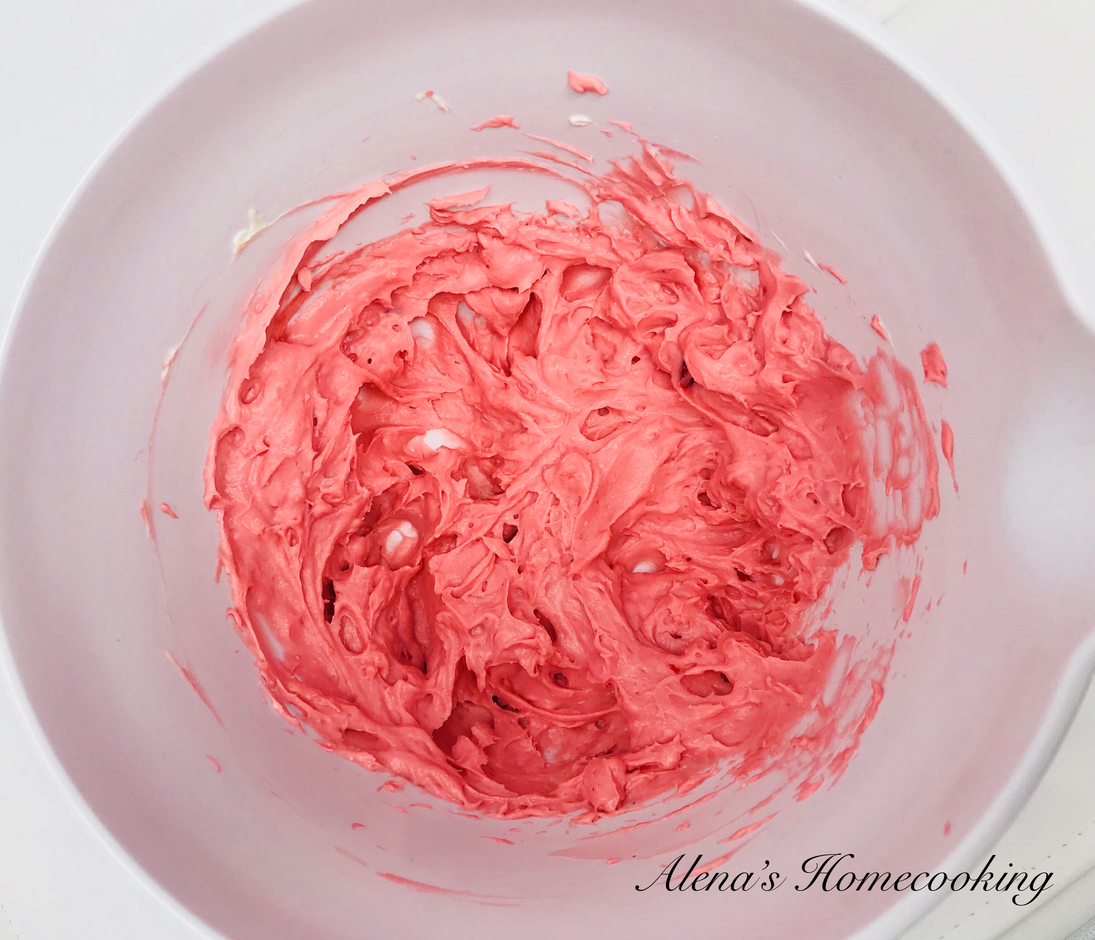 2. Prepare the cream cheese topping: using a hand mixer cream together 4oz cream cheese (room temperature) and add 3 full tablespoons of the pie filling (avoid the strawberry pieces)
